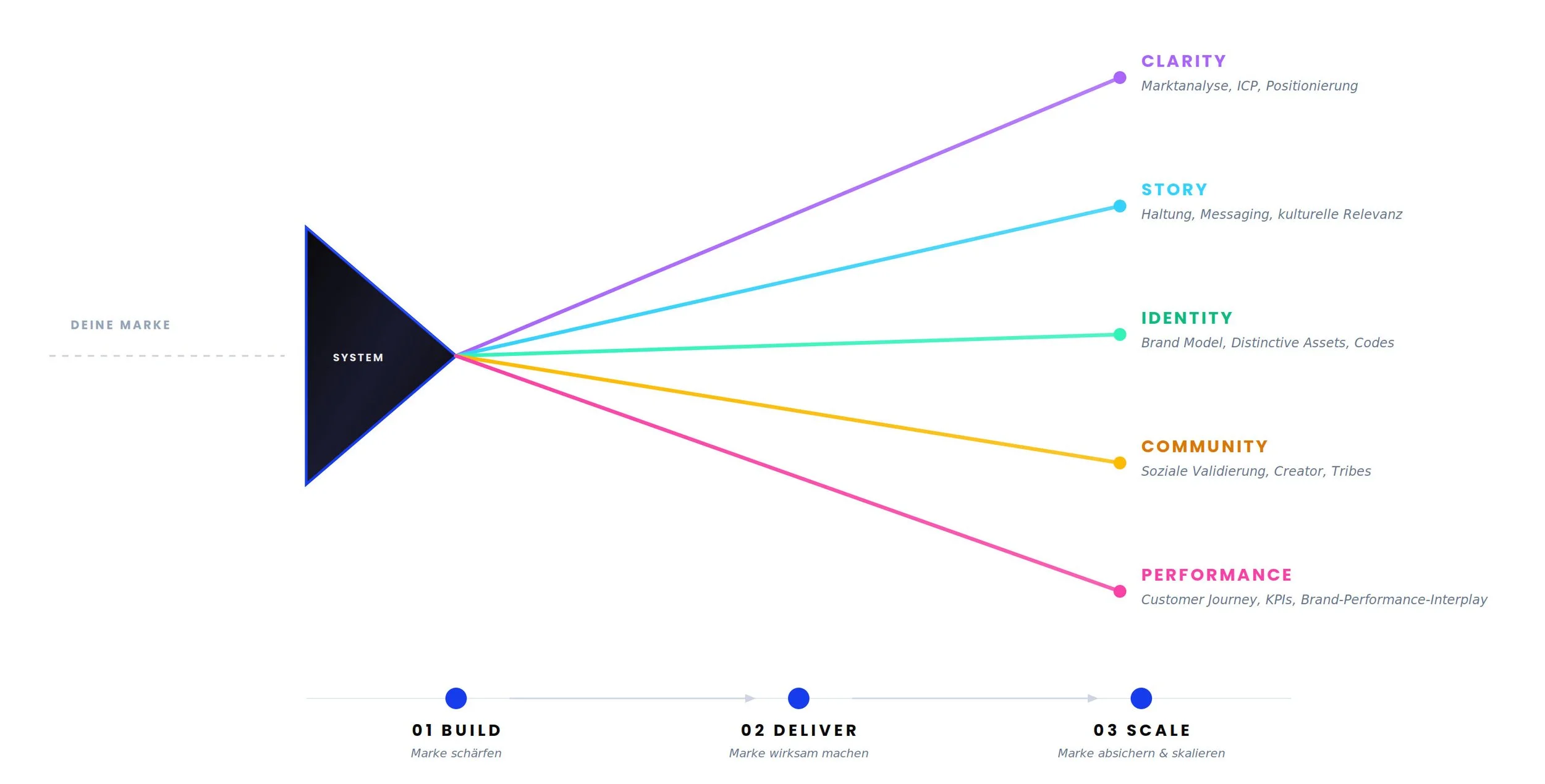 Das Brand Impact System ist ein 1:1 Programm, das deine Marke und Marketing im KI Zeitalter zu einem klar positionierten, emotional aufgeladenen und messbar wirksamen Wachstumssystem entwickelt, indem es Marke, Performance, Customer Journey und KI zu einem steuerbaren Gesamtmodell verbindet, das dein Team eigenständig nutzen kann.